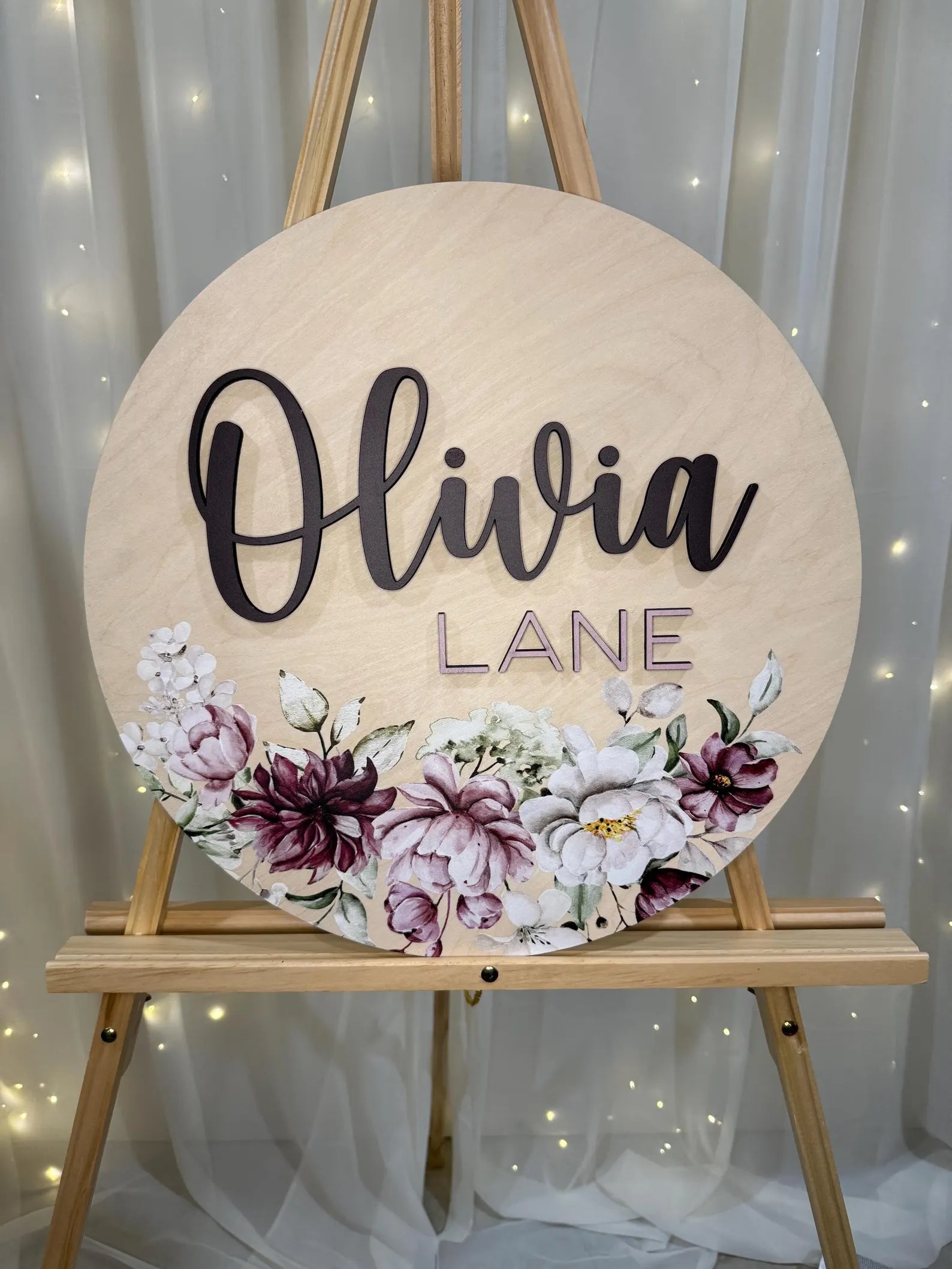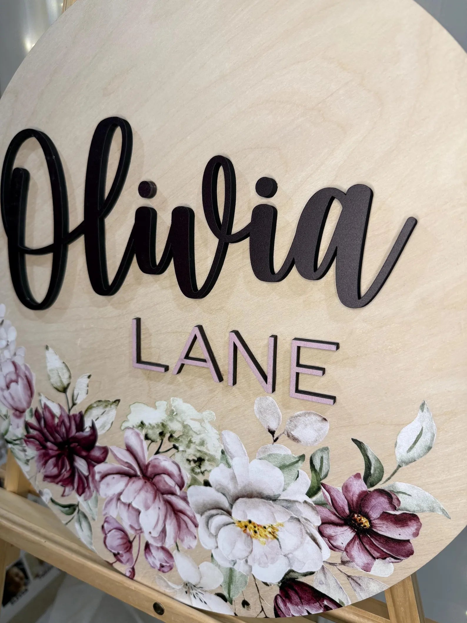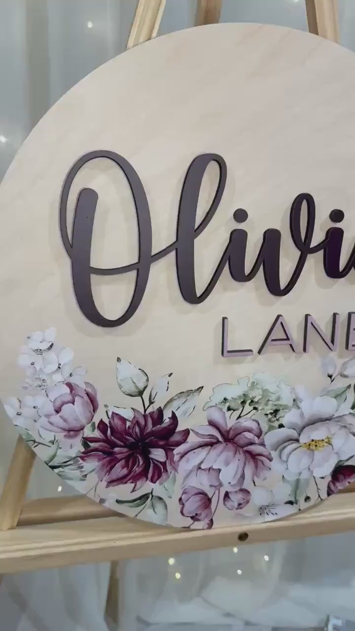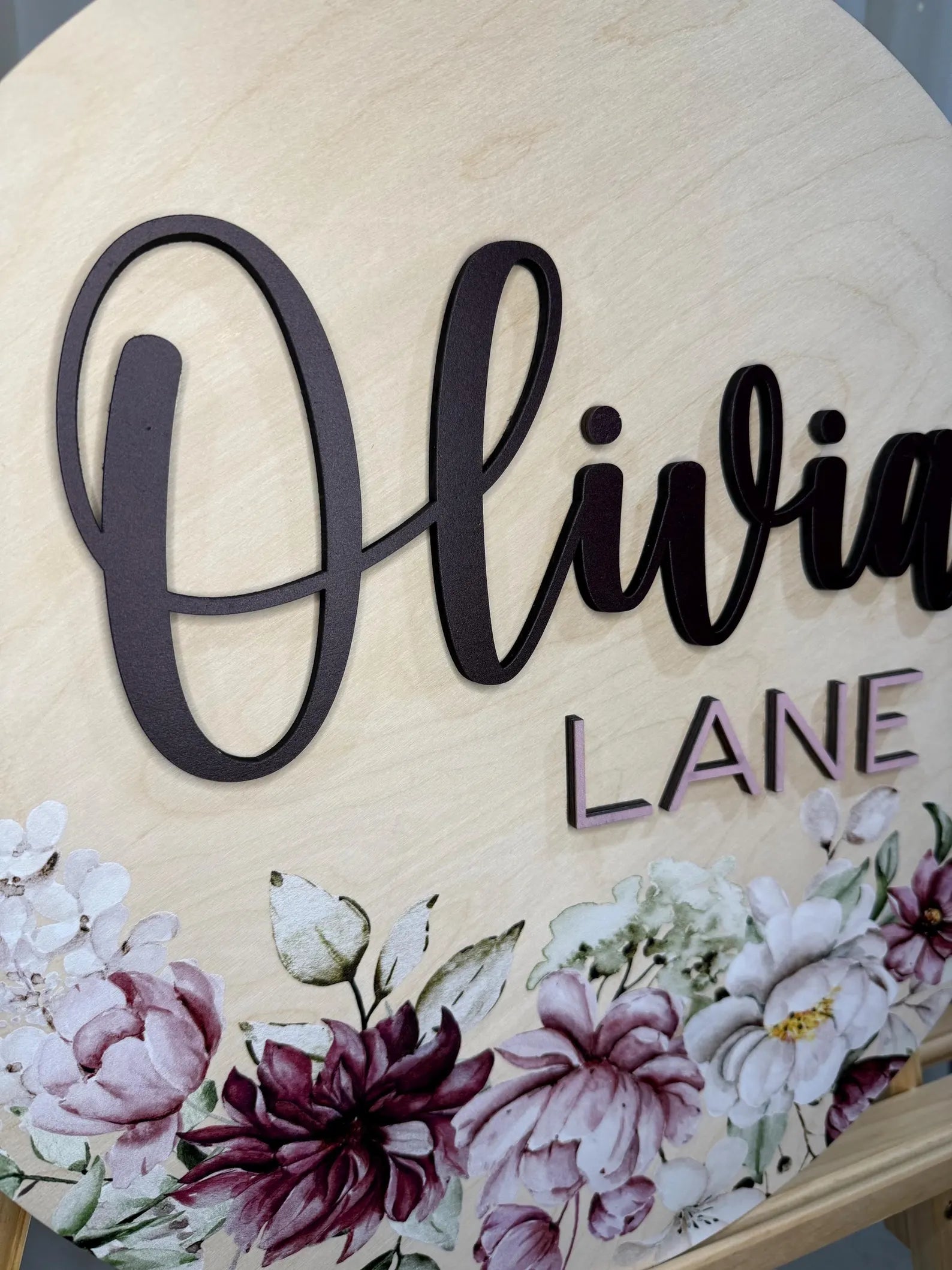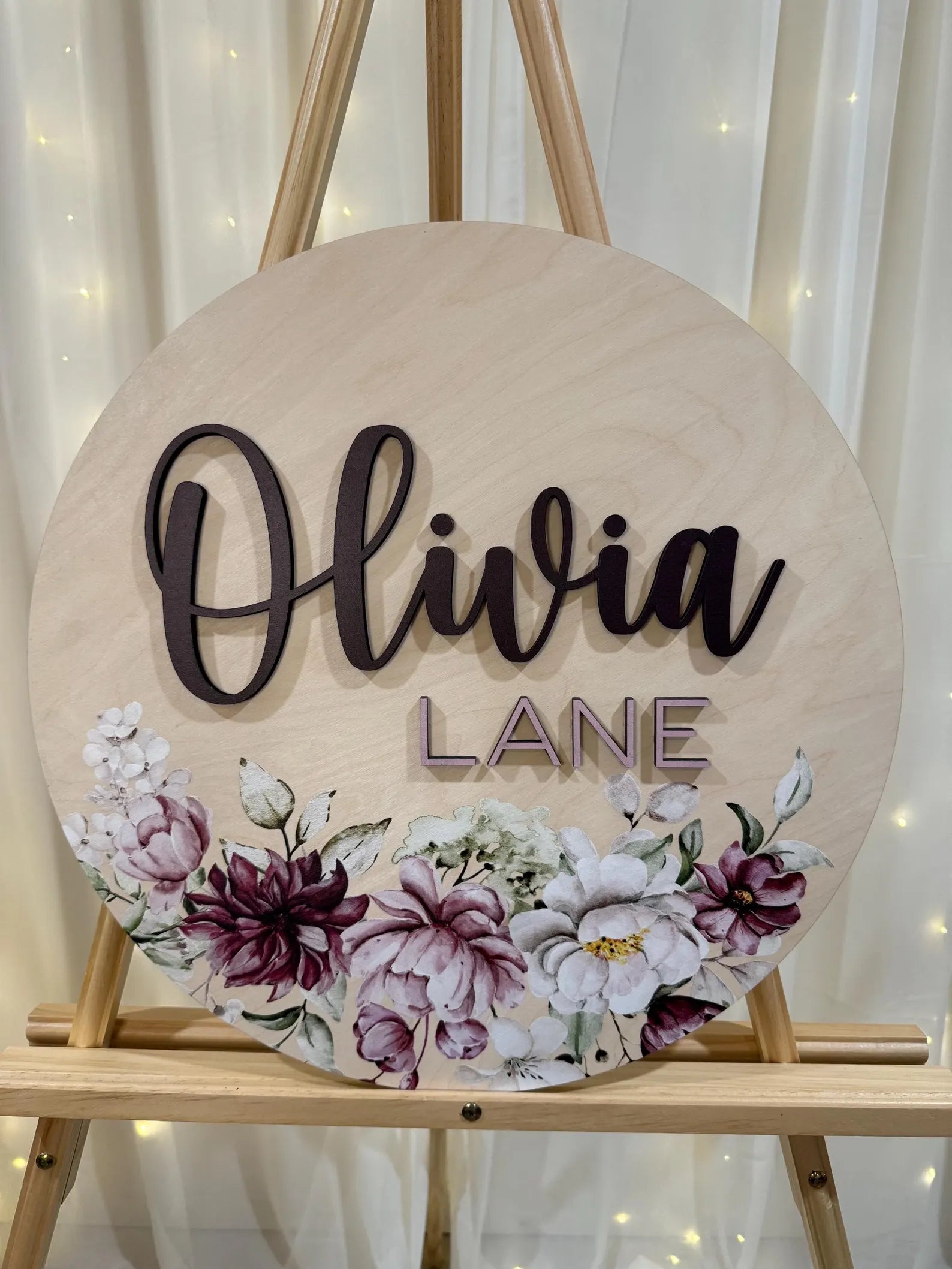This custom sign features a round wooden sign with florals and layered 3D names, These signs are the perfect addition for your kids room or nursery room décor. They also make great gifts for a baby shower and birthdays!
