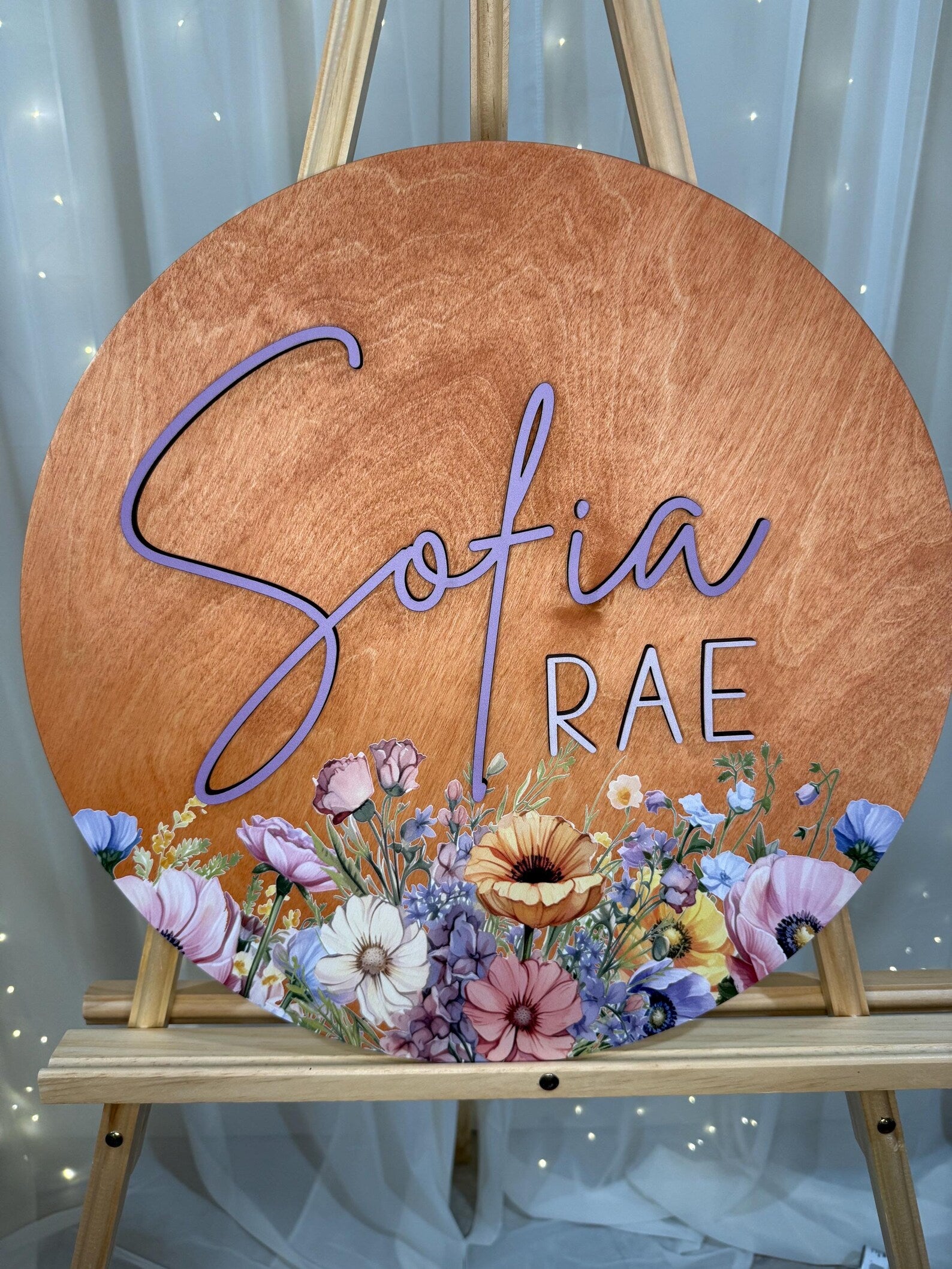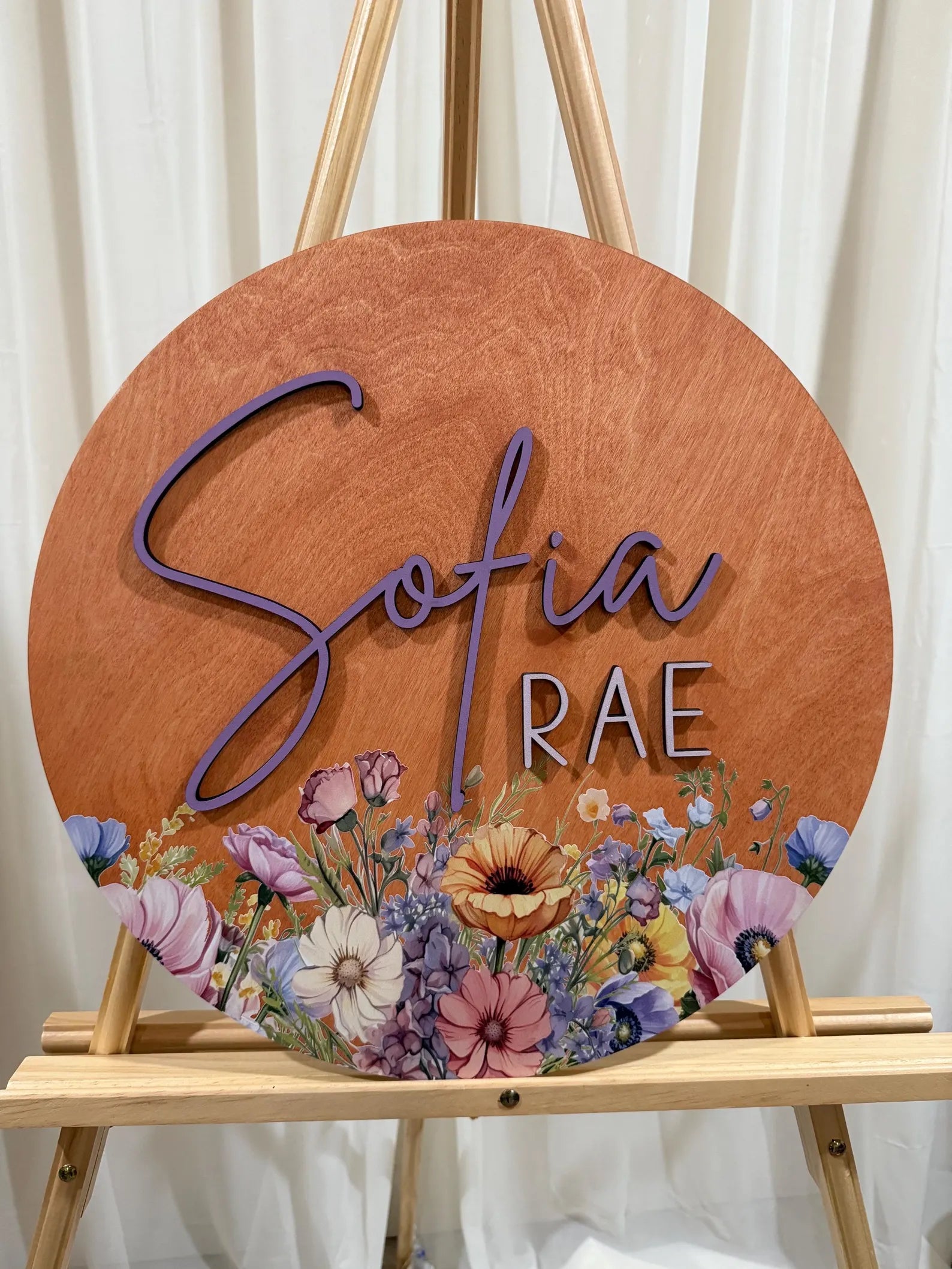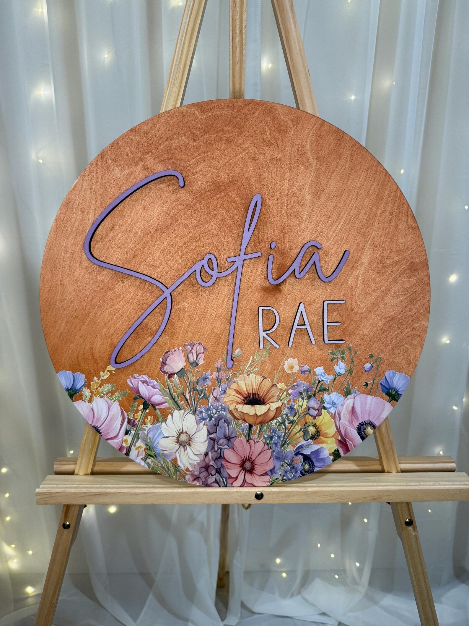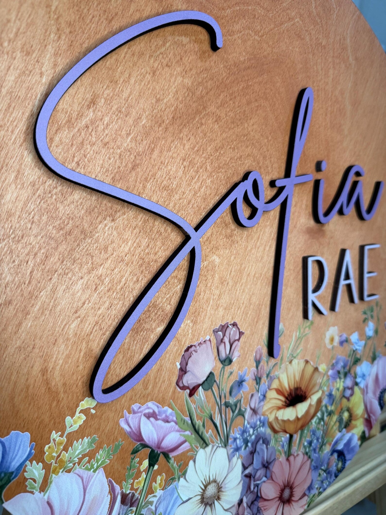 This custom sign features a round wooden sign with florals and layered 3D names, These signs are the perfect addition for your kids room or nursery room décor. They also make great gifts for a baby shower and birthdays!